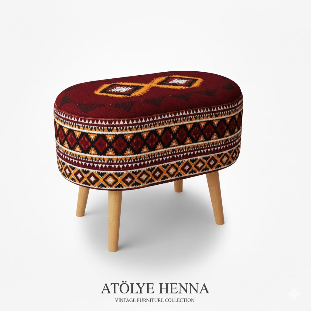 Bu özel tasarım oval puf, Atölye Henna’nın vintage estetiğini modern çizgilerle buluşturan, hem dekoratif hem de işlevsel bir parçadır. Oval formu sayesinde mekâna yumuşaklık ve akış hissi kazandırırken, el işçiliğiyle zenginleştirilmiş yüzeyi görsel bir şölen sunar.